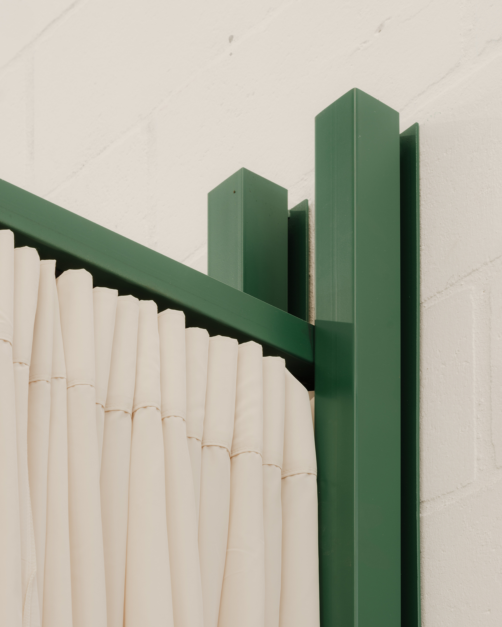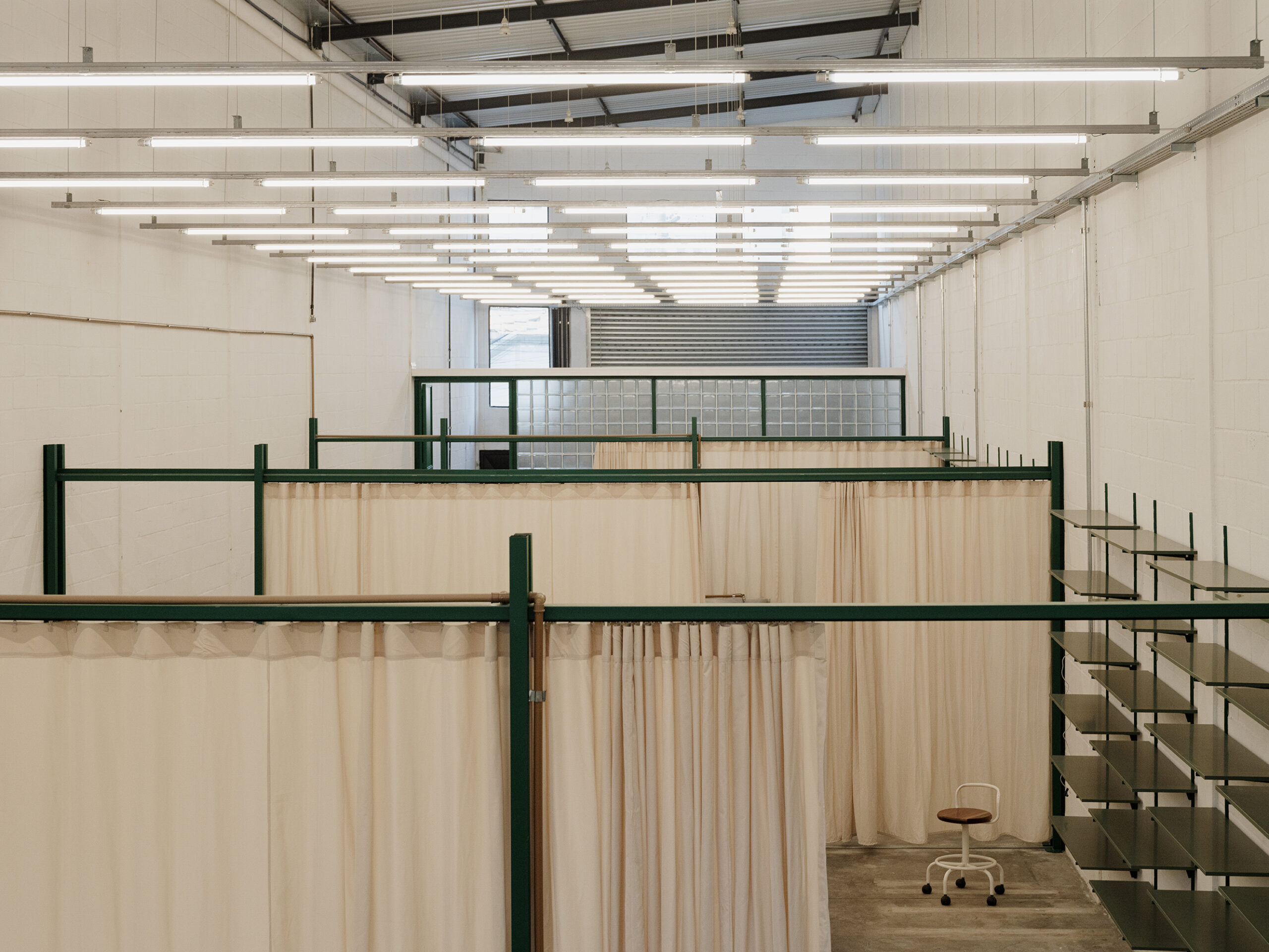 O galpão escolhido, com 36,50 m por 6,50 m, fica na Mooca — bairro historicamente marcado por oficinas, pequenas fábricas e galpões industriais, traços que ainda moldam seu caráter urbano. Relativamente novo e bem conservado, o imóvel teve sua fachada original, cobertura e núcleo de serviços preservados, permitindo que o projeto se concentrasse sobretudo na adição de elementos arquitetônicos de forte presença visual e cromática, peças que passam a habitar e ocupar o grande vazio do galpão.