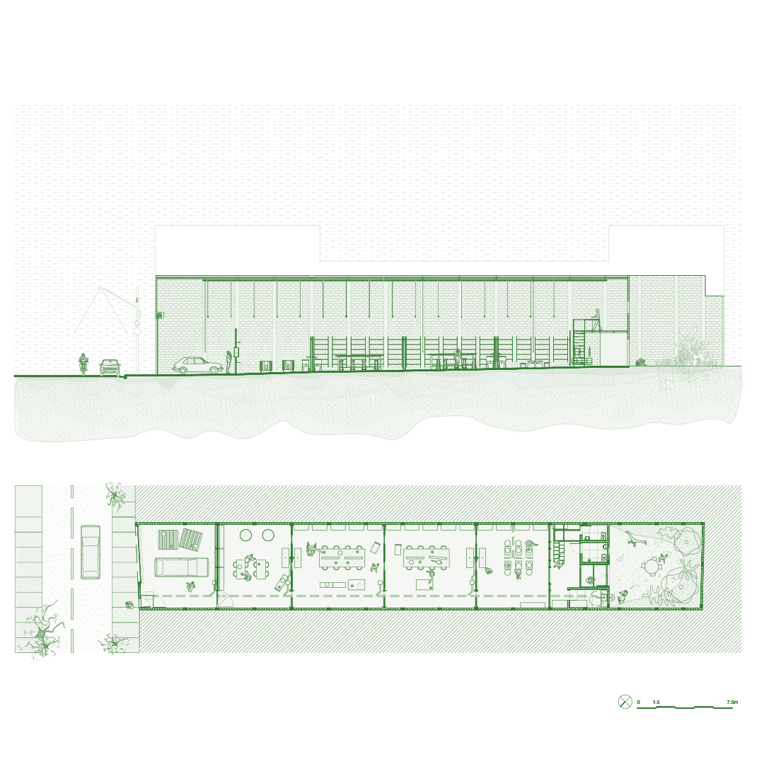 Sobre o núcleo de banheiros existente, foi criado um mezanino para a administração, acessado por uma escada Santos-Dumont em metal verde — mais um dos elementos de caráter marcante que passam a integrar o conjunto. A iluminação, pensada para garantir conforto no uso como escola-oficina, é formada por perfilados galvanizados com lâmpadas tubulares dispostos ao longo do espaço. Nos fundos do lote, a área externa recebeu um jardim de plantas de sombra sobre piso de brita, a partir do projeto paisagístico da arquiteta Claudia Bresciani.