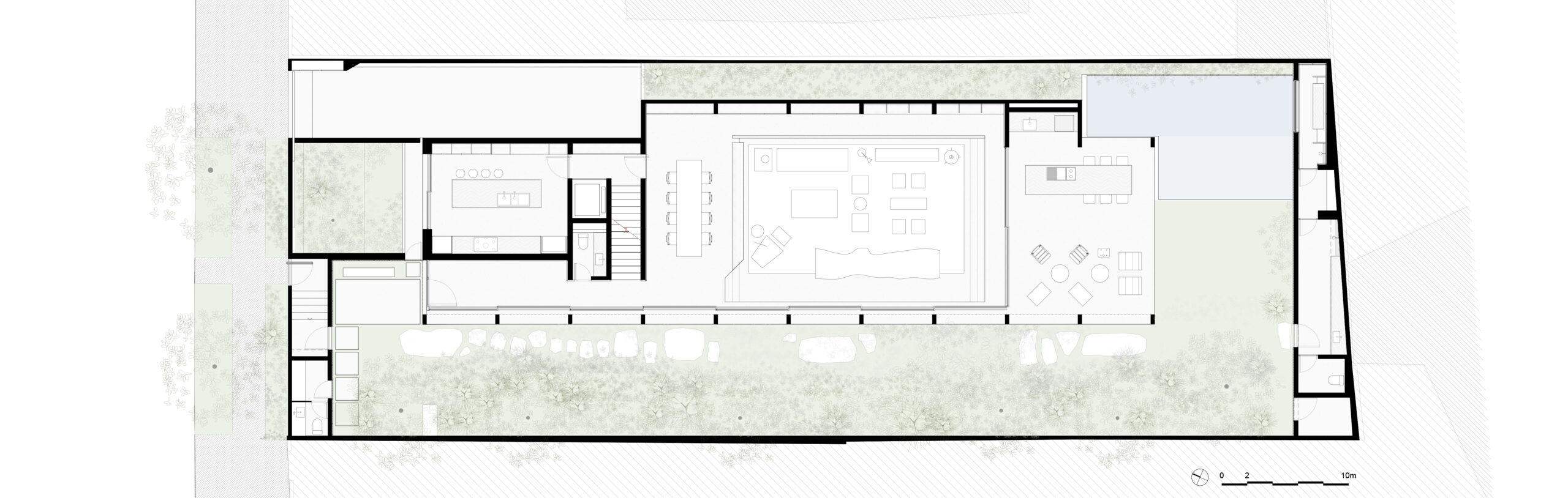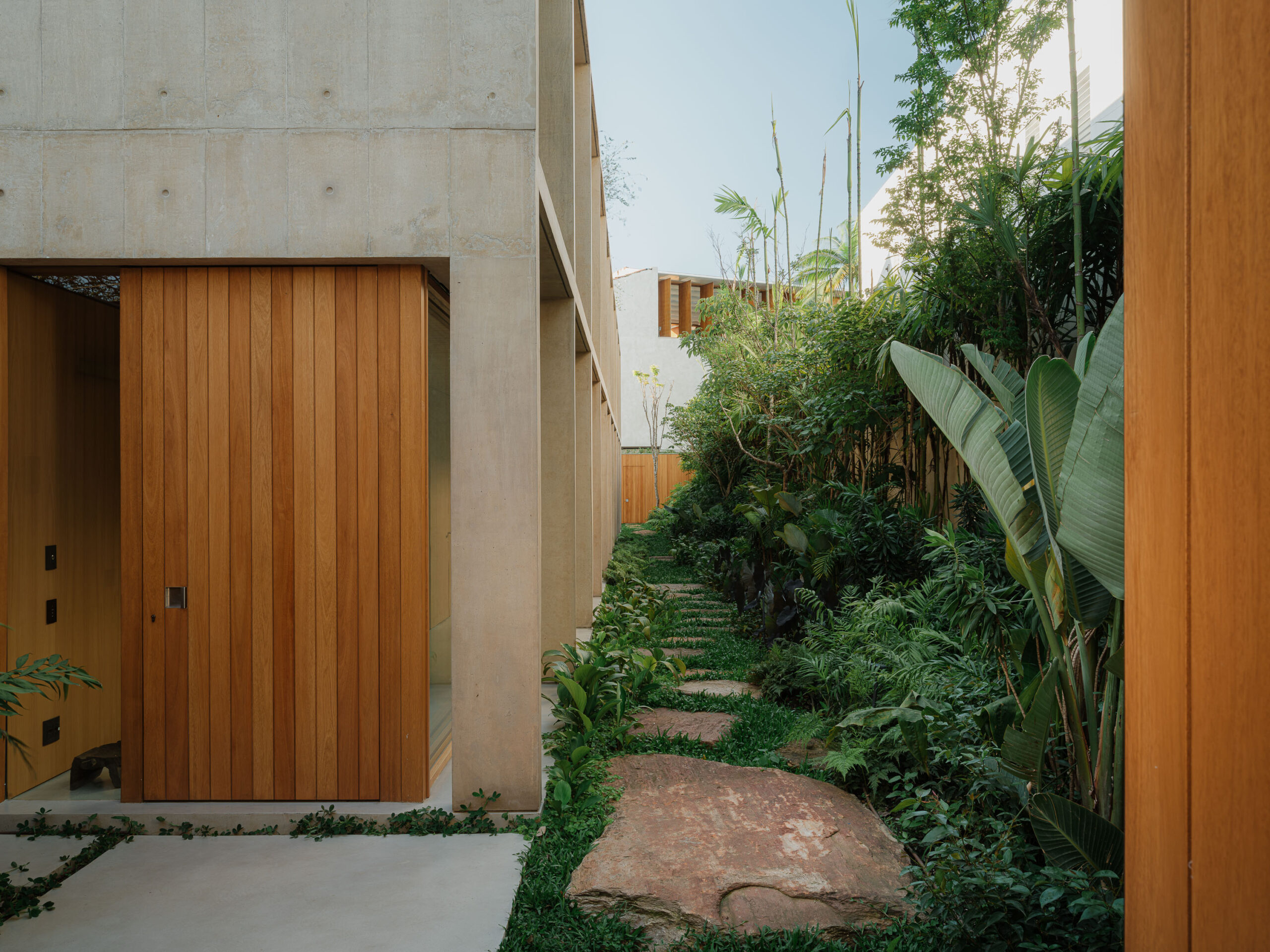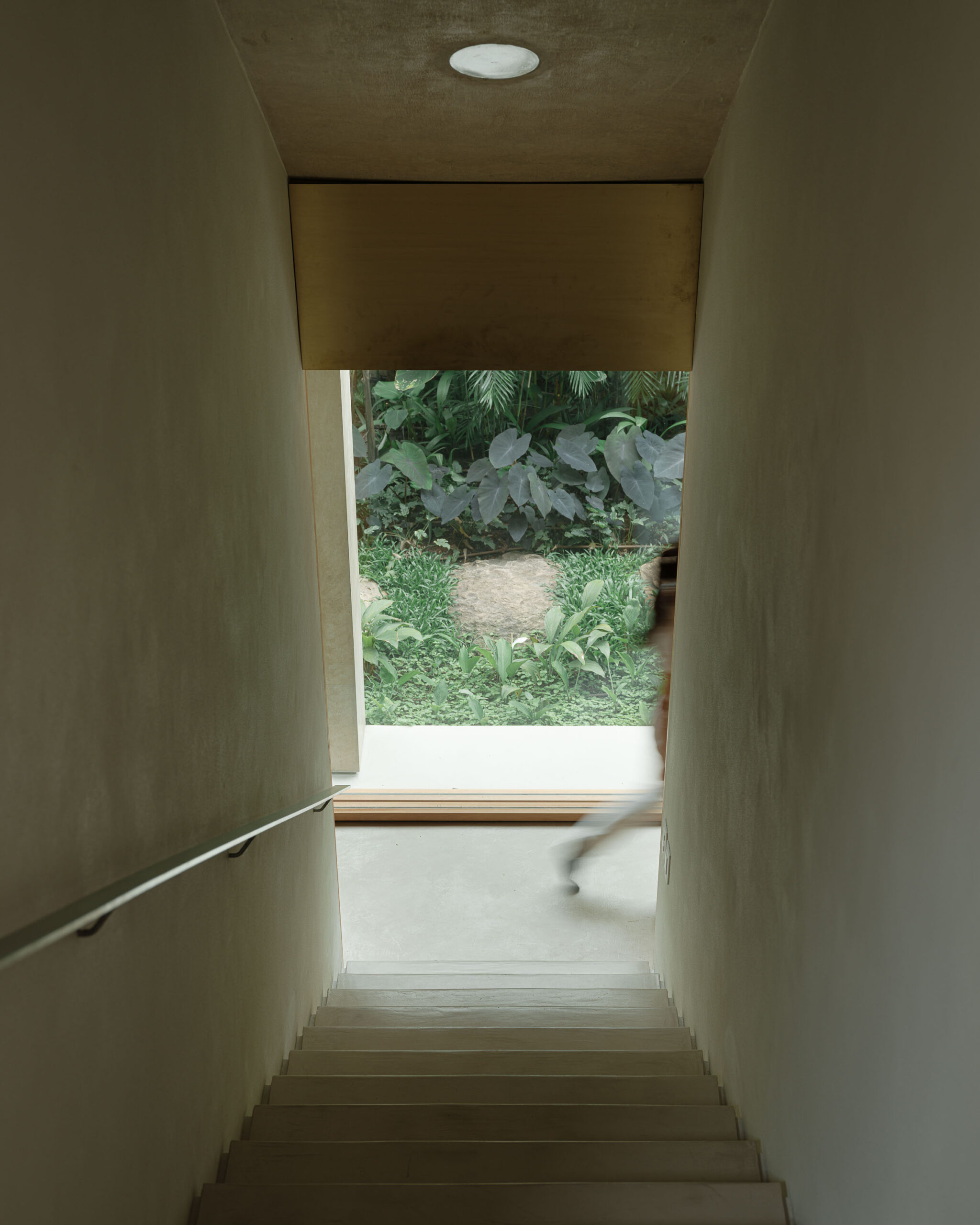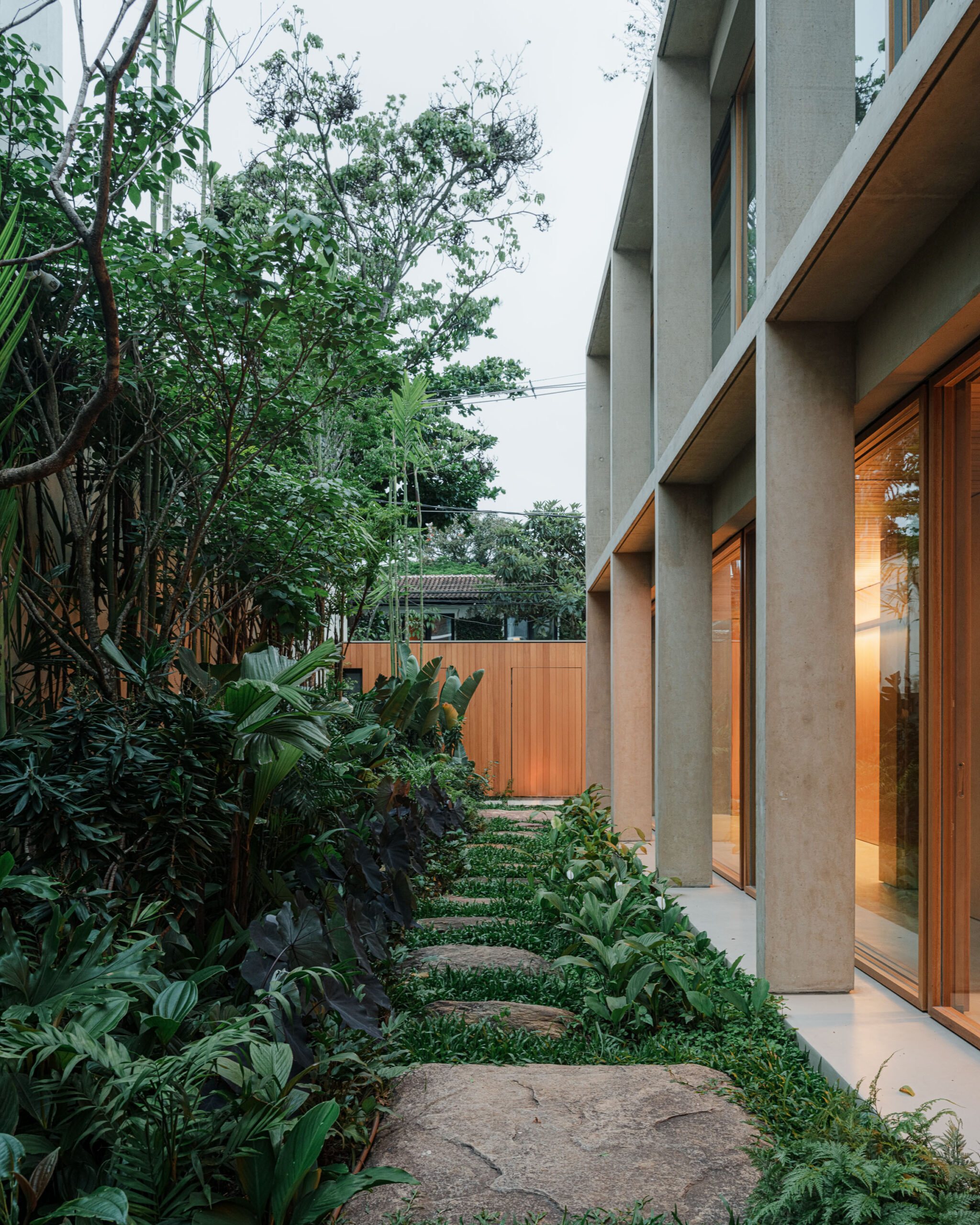 A arquitetura vista de pontos nodais – Buscamos, na implantação da casa, deixar livre uma porção do terreno que perpassa praticamente toda a profundidade do lote de 42 por 15m. Disso se conformou uma situação em que, ao se adentrar no lote, o jardim se releva na frente e a casa, paralela a extensão do jardim, à esquerda. Essa vista externa da casa logo na entrada do lote, foi pensada como um ponto nodal de percepção do espaço. O percurso pela obra se faz, daí em diante, a partir da construção de uma sequência de vistas que exploram a frontalidade e a profundidade do espaço, minimizando diagonais.