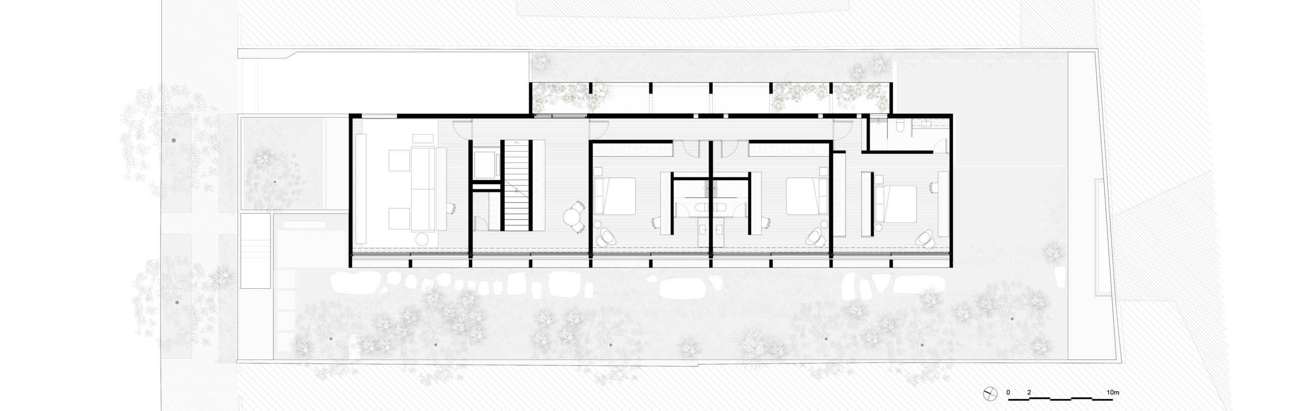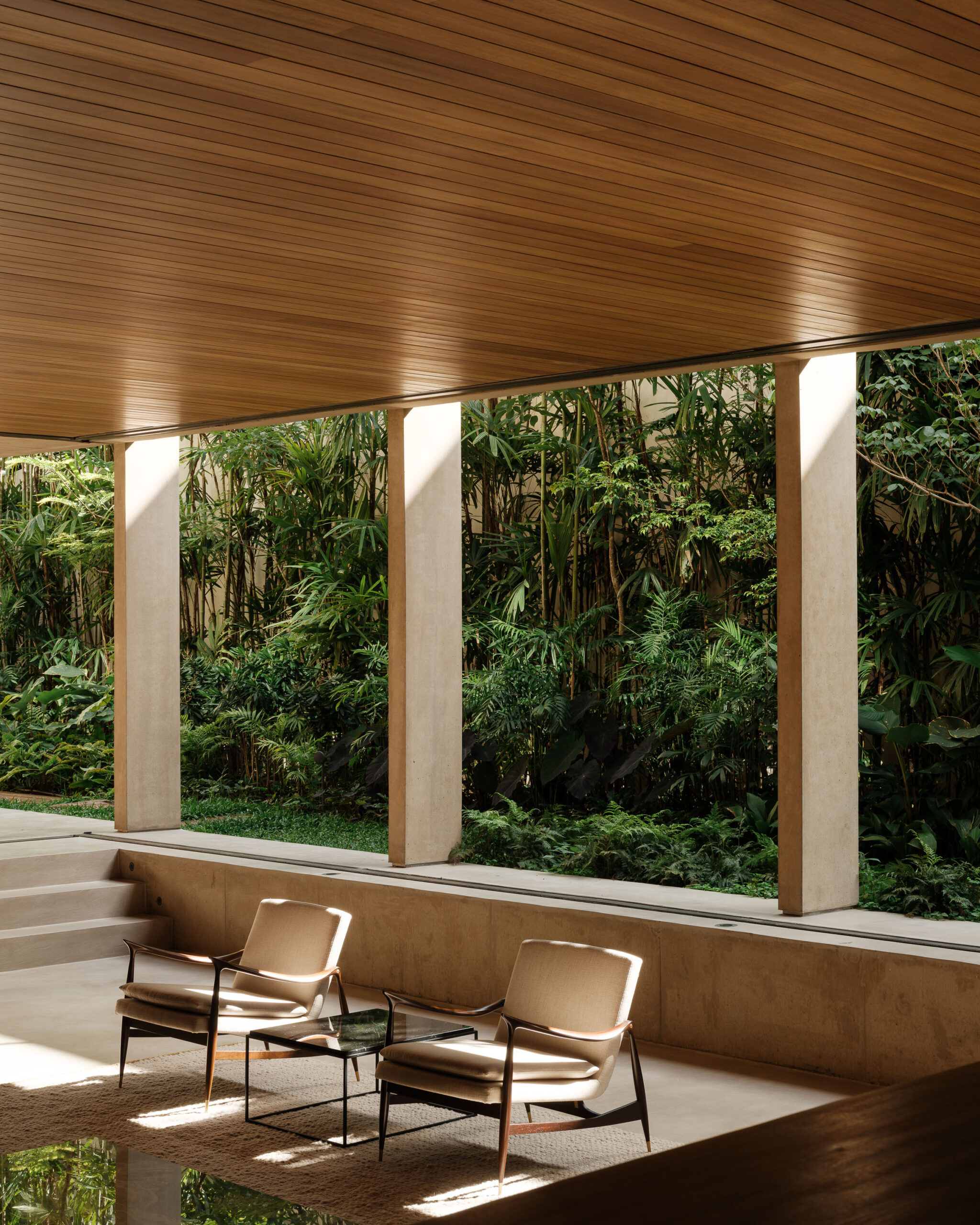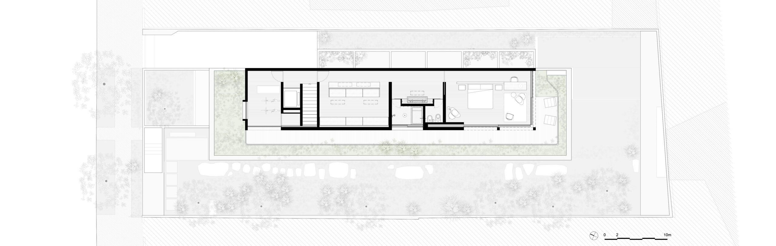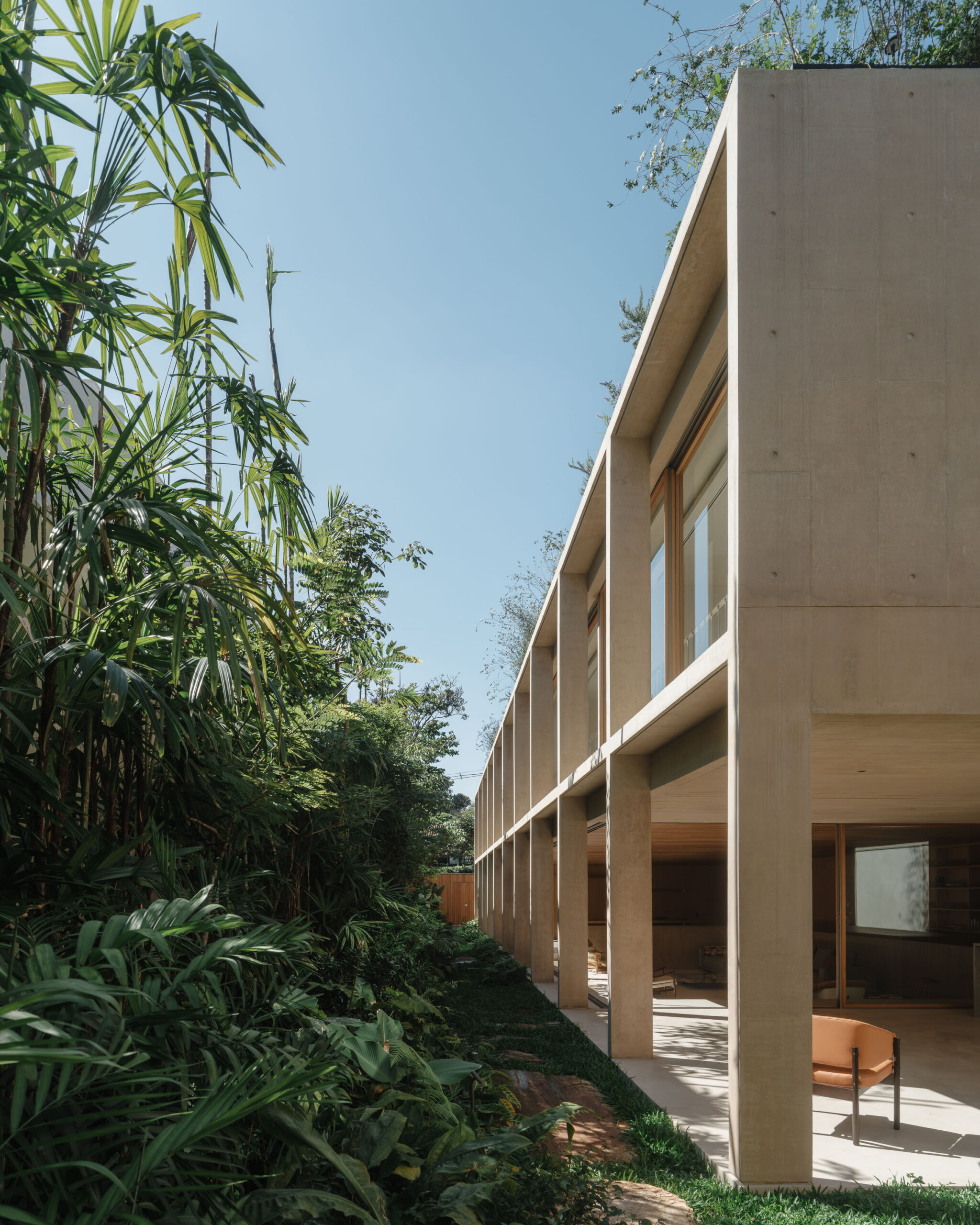 Uma seção de um grid infinito – Os módulos de concreto da fachada, cada um com 2,90 metros de largura e 3,00 de altura, se repetem perpendicularmente ao longo de praticamente todo o terreno, em dois andares. Imaginamos que a casa fosse uma espécie de ocupações prototípica que poderia percorrer todo o território. As empenas cegas, no fundo e na frente, marcam um corte, abrupto, nessa continuidade, e sinalizam uma continuação infinita. A repetição está no cerne da ideia do minimalismo, mas aqui propomos uma reinterpretação dessa questão.