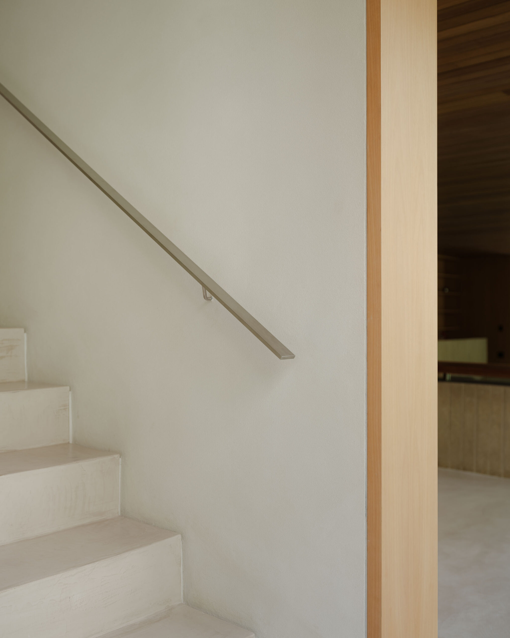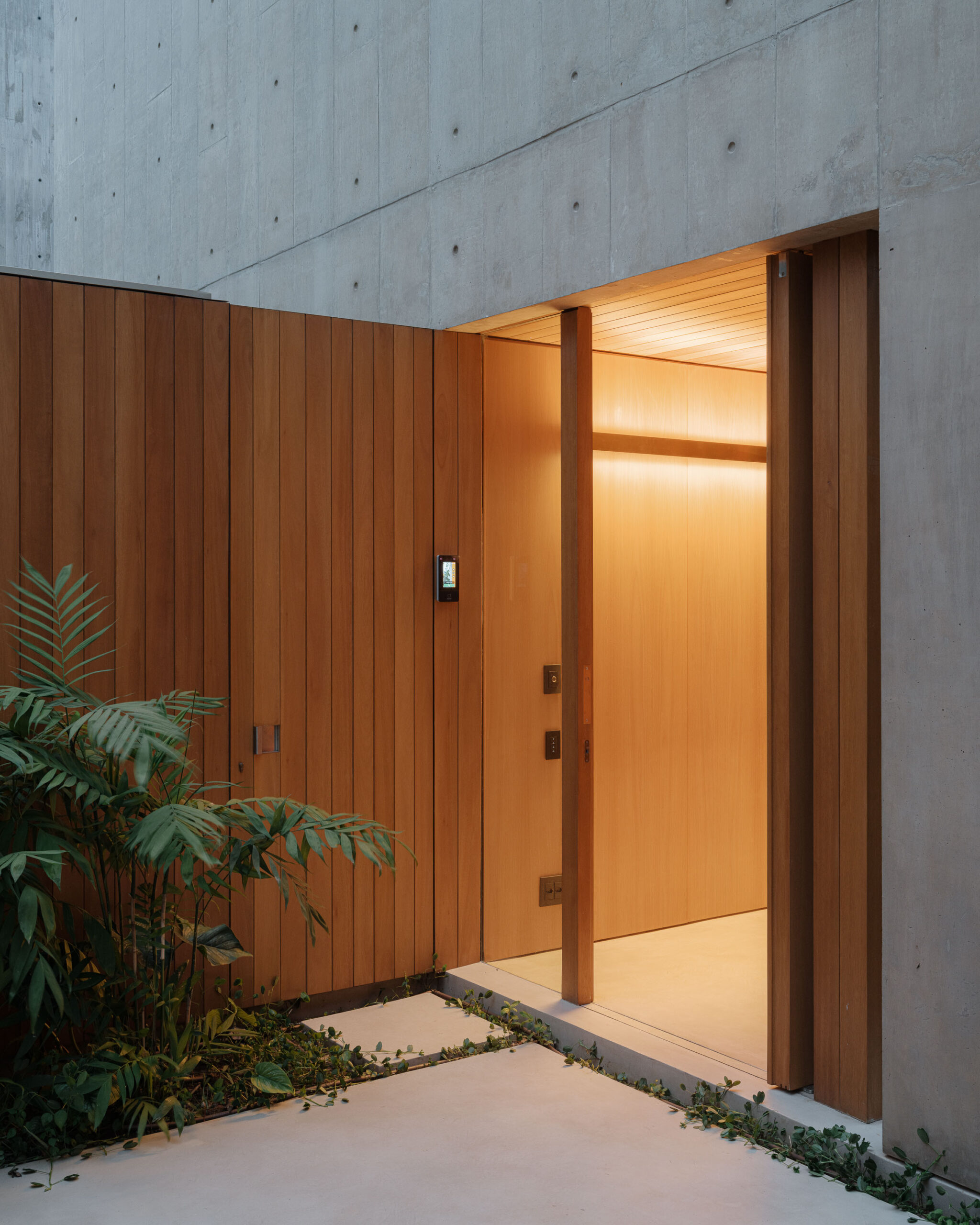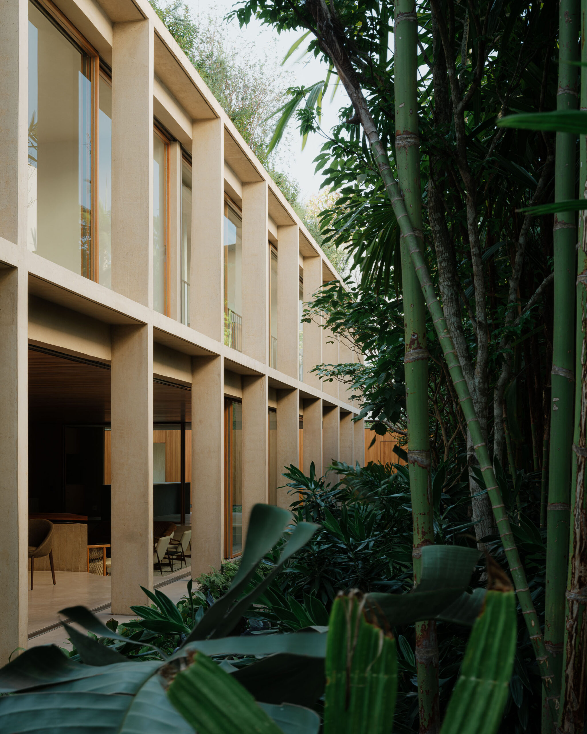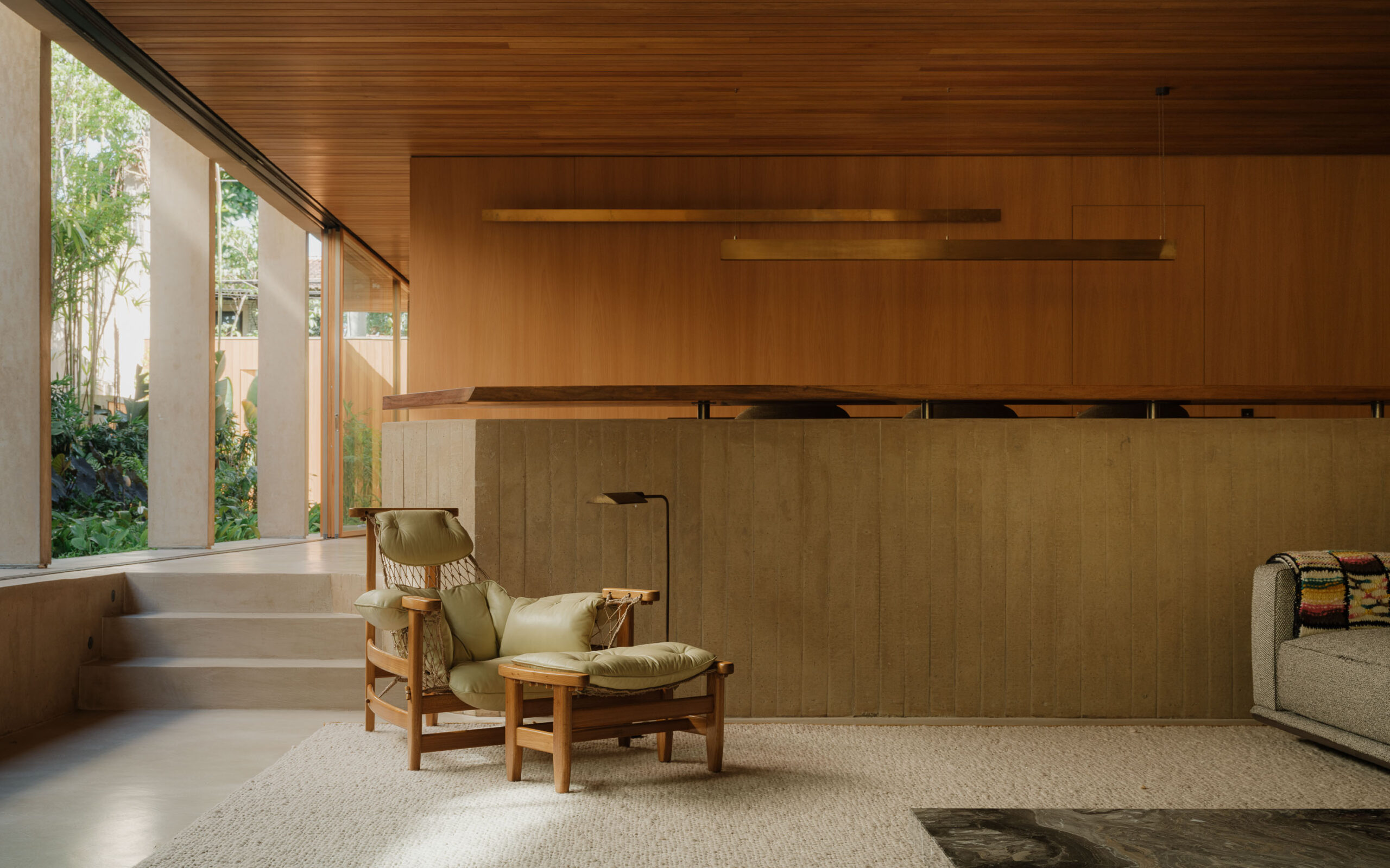 Uma seção de um grid infinito – Os módulos de concreto da fachada, cada um com 2,90 metros de largura e 3,00 de altura, se repetem perpendicularmente ao longo de praticamente todo o terreno, em dois andares. Imaginamos que a casa fosse uma espécie de ocupações prototípica que poderia percorrer todo o território. As empenas cegas, no fundo e na frente, marcam um corte, abrupto, nessa continuidade, e sinalizam uma continuação infinita. A repetição está no cerne da ideia do minimalismo, mas aqui propomos uma reinterpretação dessa questão.