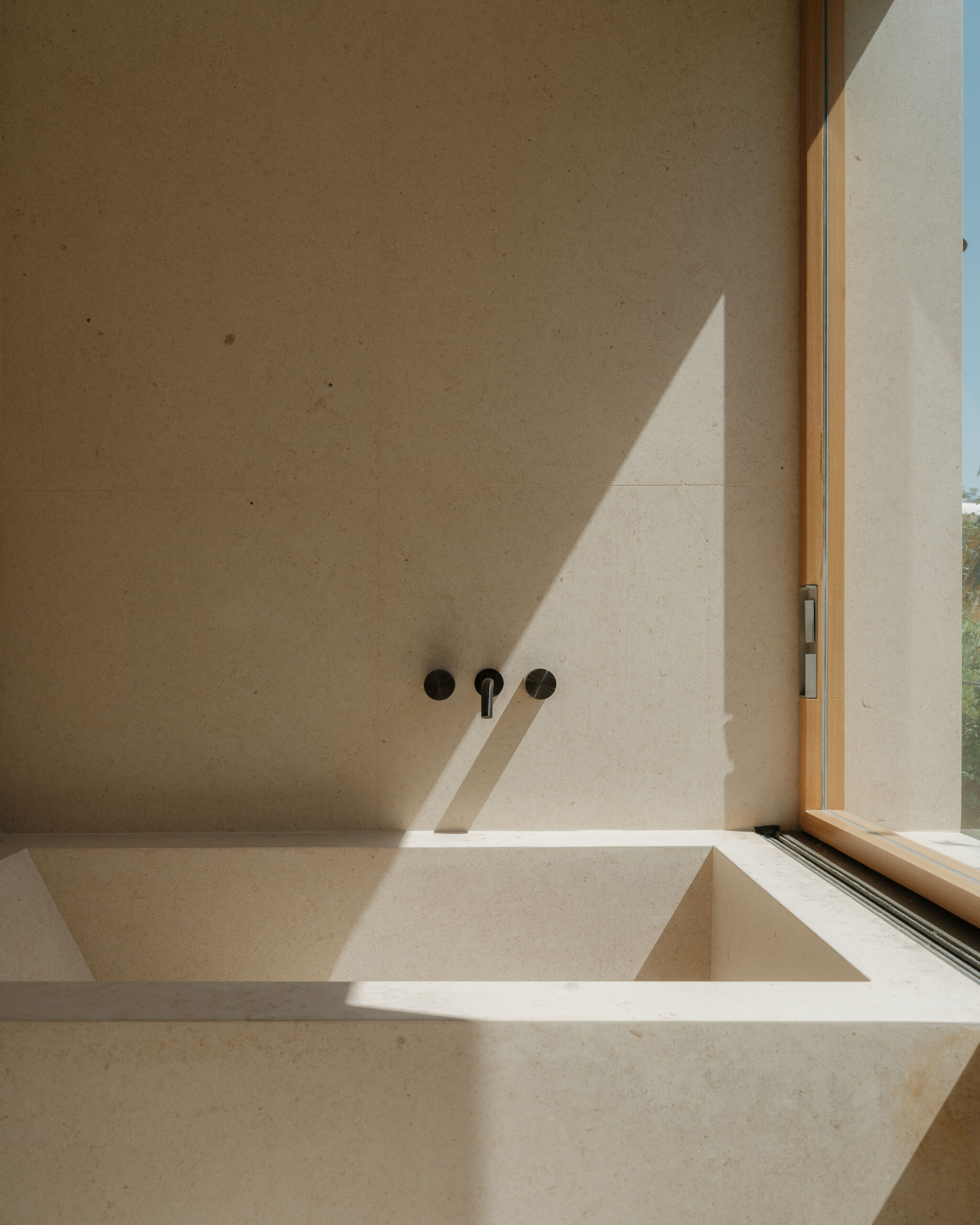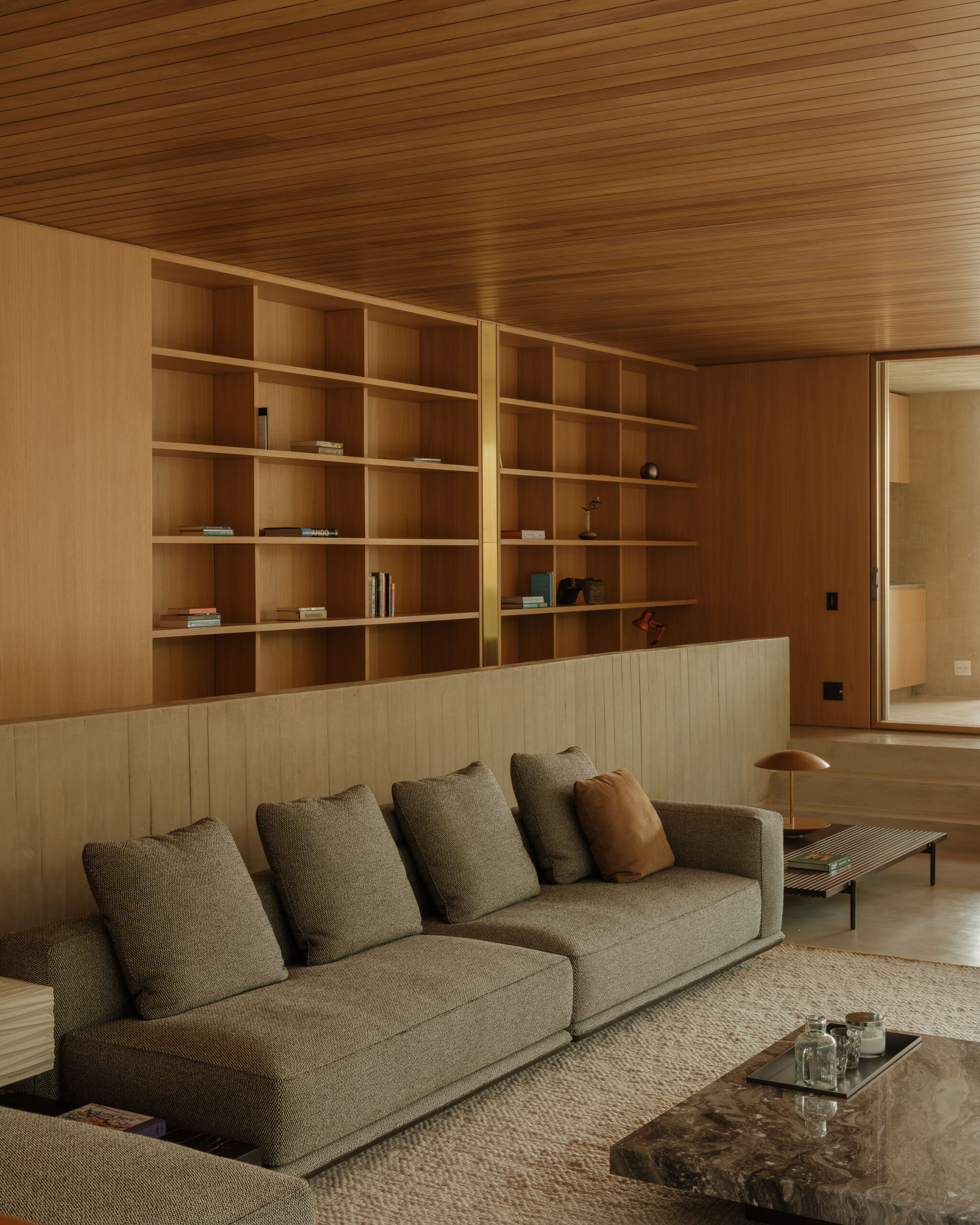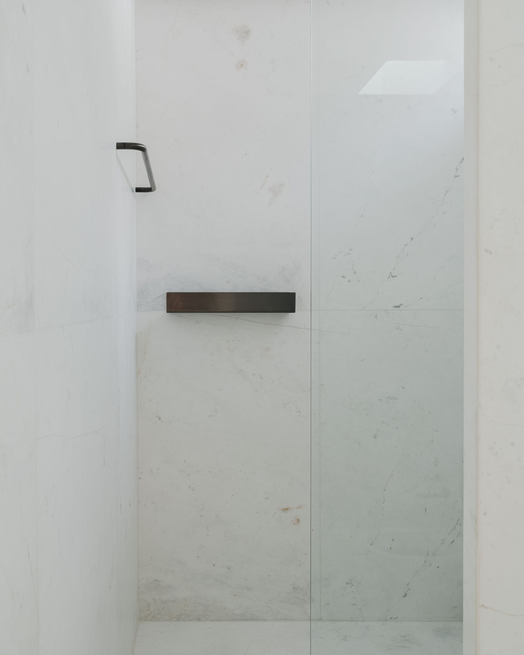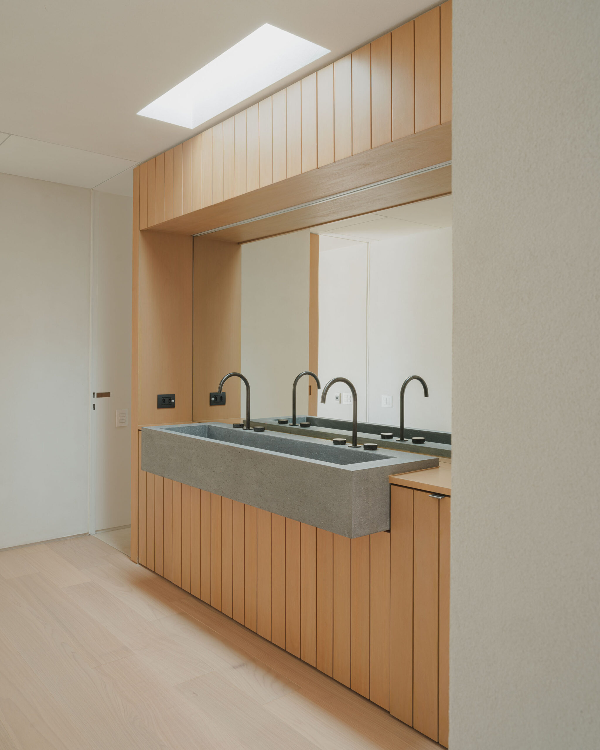 Uma seção de um grid infinito – Os módulos de concreto da fachada, cada um com 2,90 metros de largura e 3,00 de altura, se repetem perpendicularmente ao longo de praticamente todo o terreno, em dois andares. Imaginamos que a casa fosse uma espécie de ocupações prototípica que poderia percorrer todo o território. As empenas cegas, no fundo e na frente, marcam um corte, abrupto, nessa continuidade, e sinalizam uma continuação infinita. A repetição está no cerne da ideia do minimalismo, mas aqui propomos uma reinterpretação dessa questão.