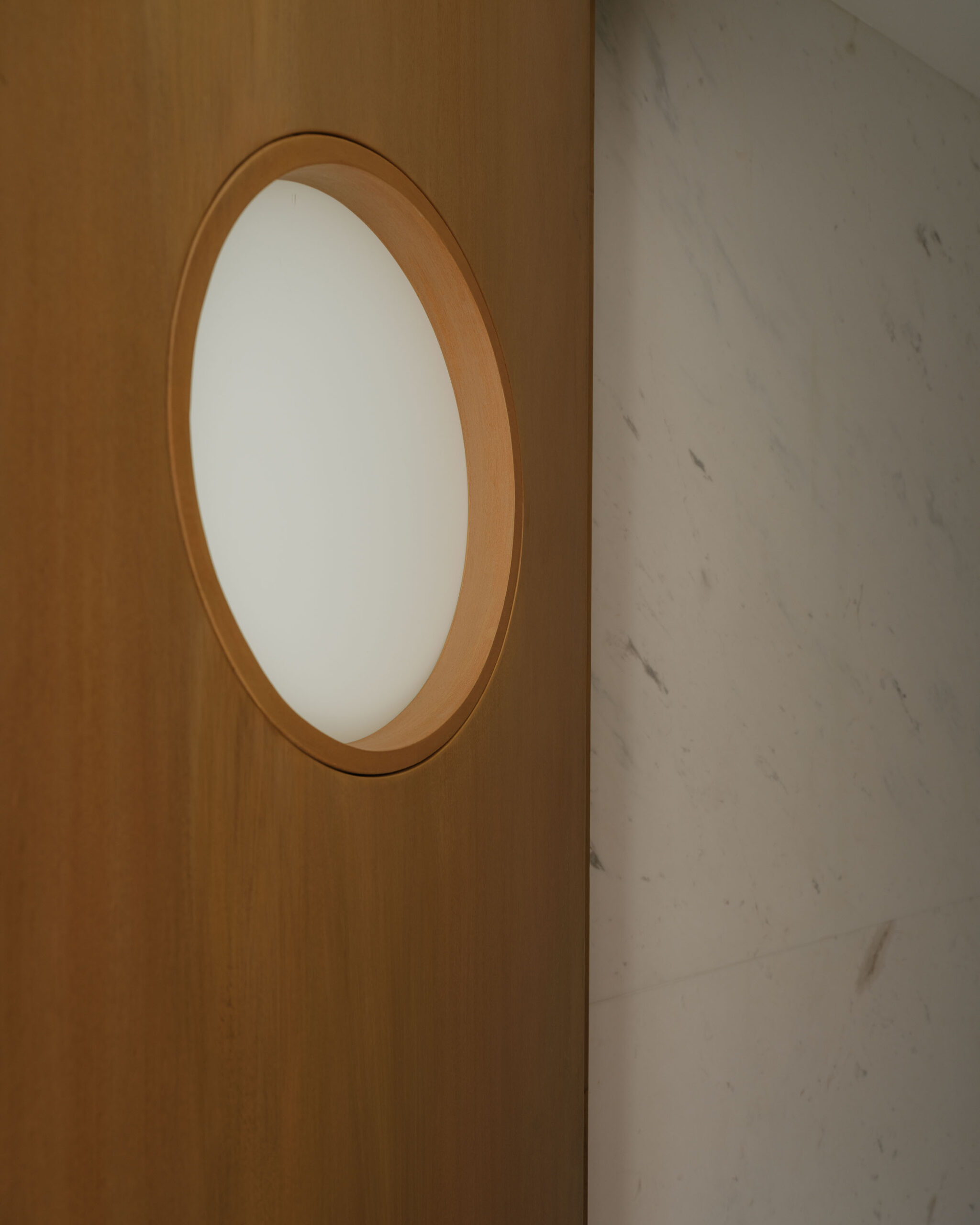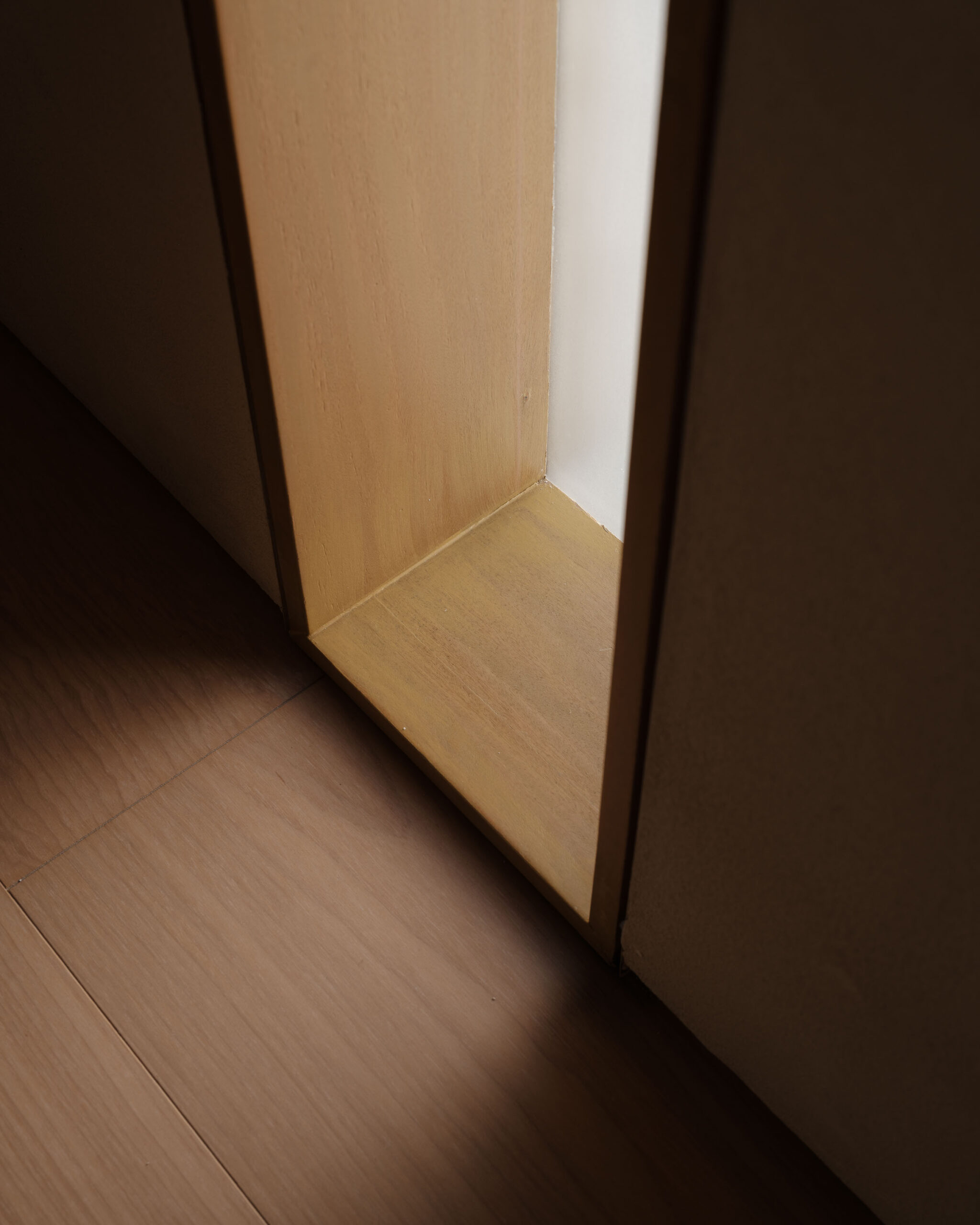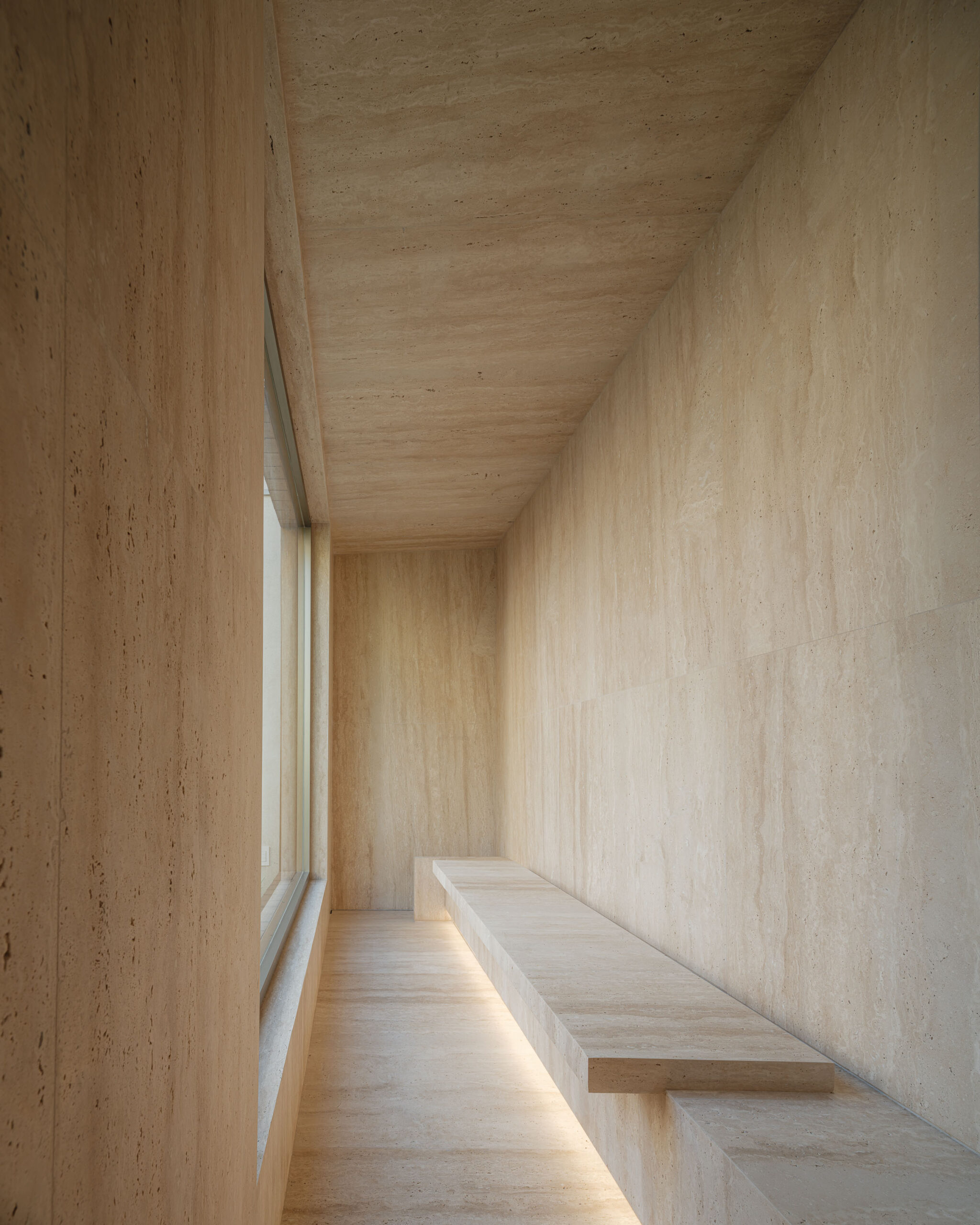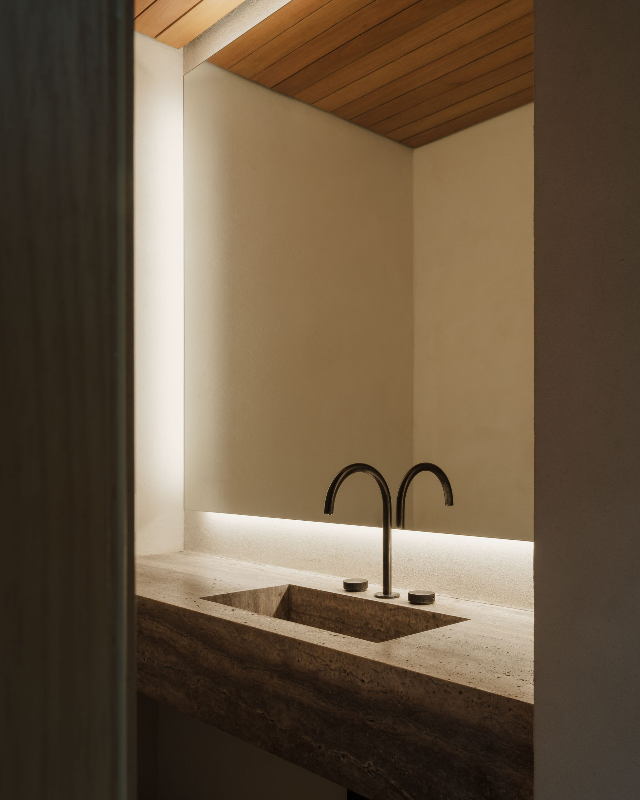 Uma seção de um grid infinito – Os módulos de concreto da fachada, cada um com 2,90 metros de largura e 3,00 de altura, se repetem perpendicularmente ao longo de praticamente todo o terreno, em dois andares. Imaginamos que a casa fosse uma espécie de ocupações prototípica que poderia percorrer todo o território. As empenas cegas, no fundo e na frente, marcam um corte, abrupto, nessa continuidade, e sinalizam uma continuação infinita. A repetição está no cerne da ideia do minimalismo, mas aqui propomos uma reinterpretação dessa questão.